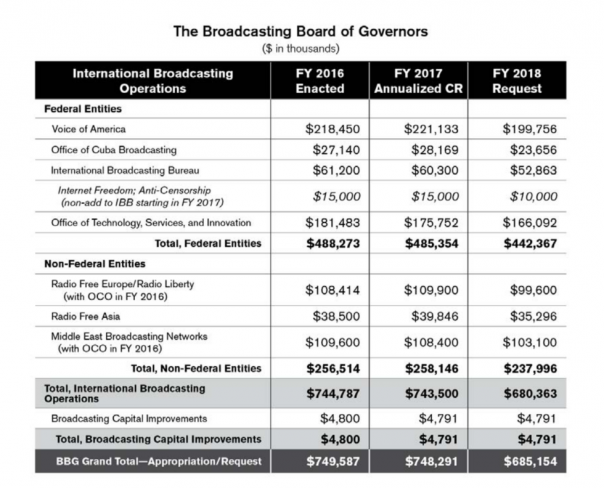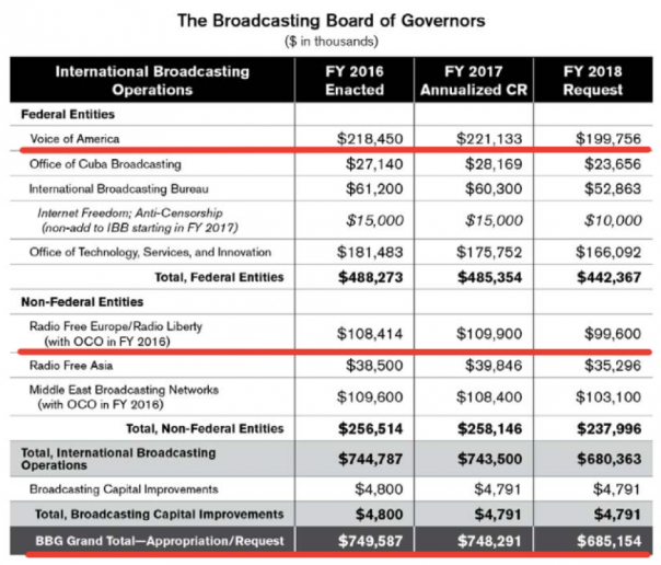 Довольно примечательно, что на 2018 год Совет управляющих вещанием США запросил у президента США годовой бюджет в размере 685 154 000 долларов, что значительно меньше, чем те же расходы организации в 2016 и 2017 годах — 749 587 000 и 748 291 000 долларов соответственно. Тем не менее, как уже было сказано выше, конгресс решил самостоятельно увеличить эти ассигнования. При этом планировавшееся американским пропагандистским ведомством сокращение на 2018 год должно было коснуться практически всех пропагандистских служб, контролируемых советом, в том числе "Голоса Америки" (Voice of America/ VOA) и существующих на гранты "Совета радио Свободная Европа"/ "Радио Свобода" (Radio Free Europe/ Radio Liberty – RFE/RL), несмотря на то что именно на эти инструменты в 2017 году, по сравнению с 2016 годом, наблюдался рост расходов.