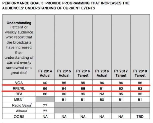 Также стоит отметить, что с 2013 по 2016 год произошло снижение доли аудитории, которая считает информацию, транслируемую в продуктах BBG, правдоподобной. Изменение составило с 91,9% до 67,2% соответственно. Проектами, о финансировании которых говорится в документе, являются: телеканал "Настоящее время" — совместный проект "Радио Свобода" и "Голоса Америки"; проект "Лексикон" — проект "Голоса Америки"; новые сайты местных новостей на чеченском, татарском и башкирском языках от "Радио Свобода"; проекты по солидаризации журналистов на телевидении и в социальных сетях; поддержка центрально-азиатского проекта при участии "Радио Свобода".