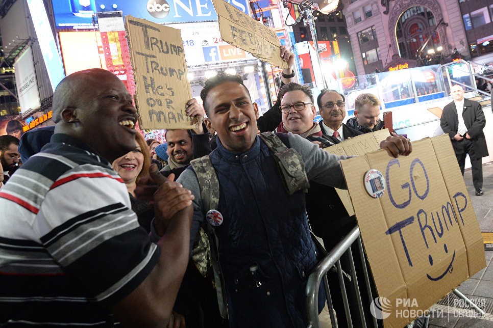 Сторонники кандидата в президенты США от Республиканской партии Дональда Трампа на площади Таймс-сквер в Нью-Йорке