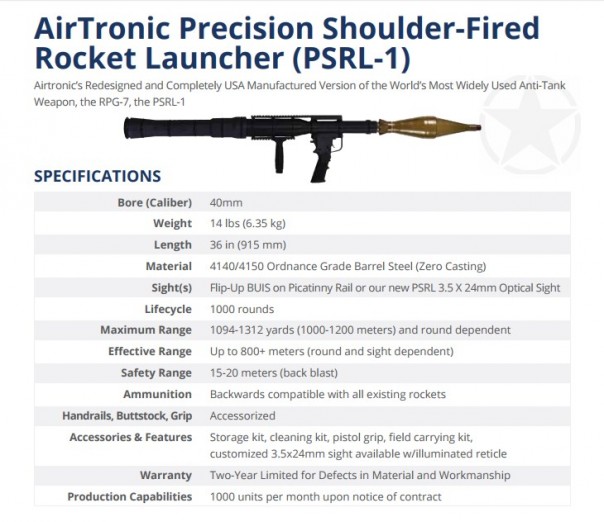 PSRL-1 (ручной противотанковый гранатомет) представляет собой модернизированную версию российского противотанкового ручного гранатомета РПГ-7. AirTronic USA запустила серийное производство этого оружия в 2016 года.