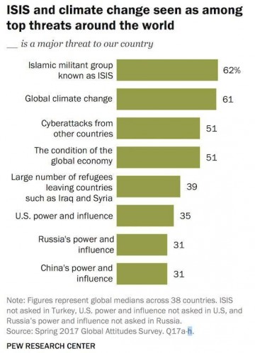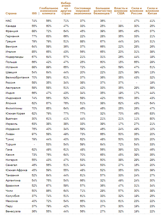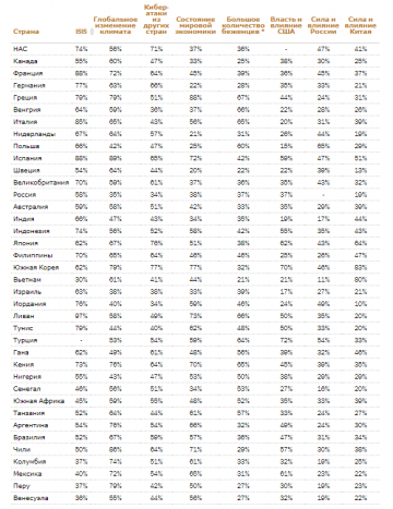 Конечно же, наиболее опасными, по мнению большинства, являются: ИГИЛ (Организация запрещена на территории РФ), глобальное изменение климата и кибератаки из других стран. Однако, что касается представляемой угрозы со стороны правительств США, РФ и КНР - Америка оказалась лидером.