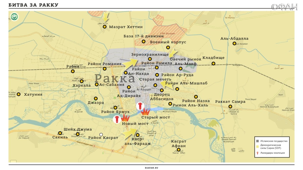 В административном центре провинции Ракка продолжаются жестокие бои между Демократическими силами Сирии (SDF) и террористами ИГИЛ, сообщает источник в Twitter (@Mustafakhaled00). Напомним, курдские отряды ополчения освободили от «Исламского государства» 60% города Ракка. Оставшаяся территория все еще находится под контролем радикальных исламистов, которые всеми силами пытаются укрепить свои позиции. При последней попытке SDF эвакуировать из осажденных ИГИЛ районов Ракки мирных жителей, террористы использовали население города в качестве живого щита.