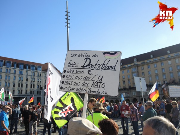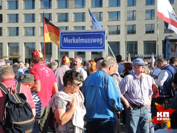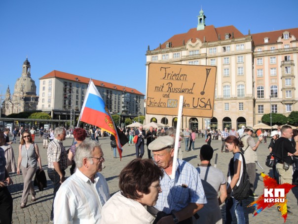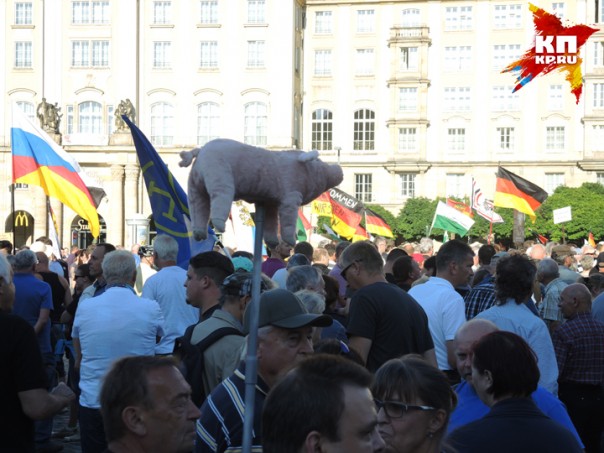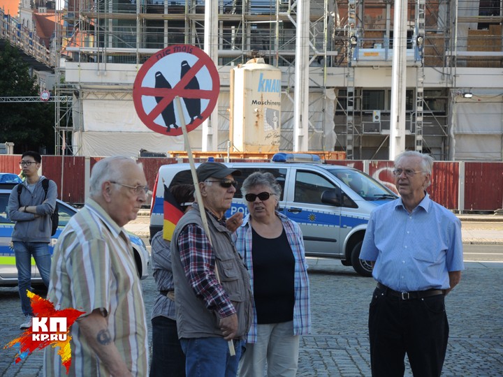 Понедельник. Центр Дрездена, окруженный множеством полицейских машин. Музыканты в народных костюмах играют народные песни, им подпевают немолодые женщины и мужчины, весело притоптывая ногами. Немало и молодых мужчин с вызывающим выражением лица. То, что я вижу, повергает меня в столбняк. Повсюду гордо развеваются русские флаги. Один флаг просто удивителен: наполовину немецкий, наполовину русский. Знаменосец пытается мне объяснить на плохом русском, что его флаг символизирует единство русских и немцев. Множество парней в футболках с портретом Путина. Плакаты с Путиным и рядом Меркель с ушами свиньи. Или Меркель в нацистской форме со знаком евро, напоминающем свастику. Плакаты с мусульманскими женщинами в бурках, перечеркнутые крест-накрест. Призывы к «дружбе с Россией» и «войне с НАТО». Люди, где я? Это Германия?