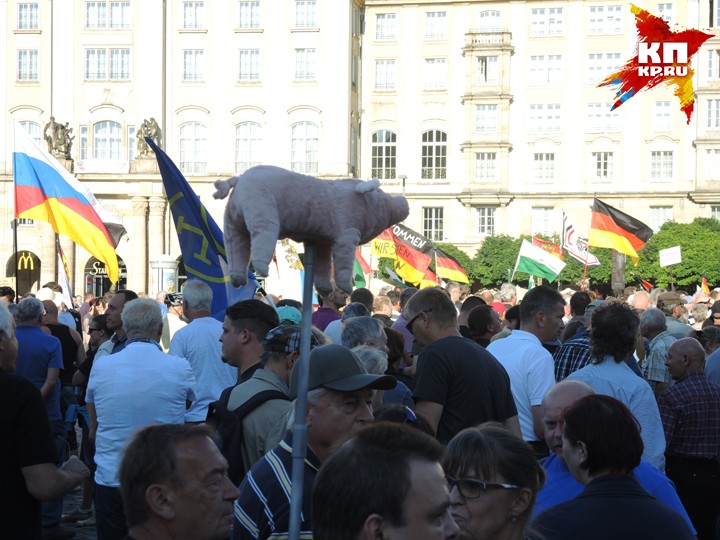Многие протестующие несут в руках плюшевых свинок. Хорошая, жирная свинья - символ сытой, христианской Германии. Никакой халяльной пищи! «Да здравствует Россия!» - кричат вокруг меня. Какая-то восторженная пожилая женщина твердит мне: «Путин - в моем сердце». У меня голова идет кругом.