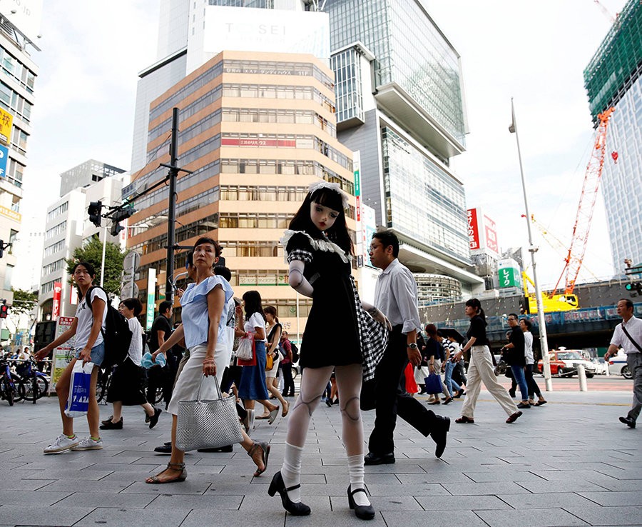 Придумана человеческая кукла, которая выходит на улицу в парике, маске и разработанных для нее чулках.