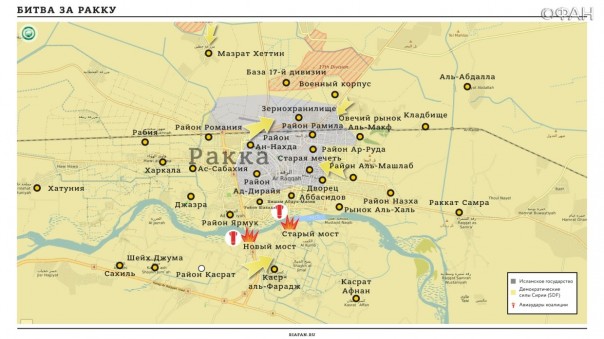 В административном центре провинции Ракка продолжаются ожесточенные бои между Демократическими силами Сирии (SDF) и террористами «Исламского государства». Местный источник в Twitter (@Raqqa_SL) пишет, что в эпицентре боевых действий в городе Ракка находится мечеть Аль-Нур.