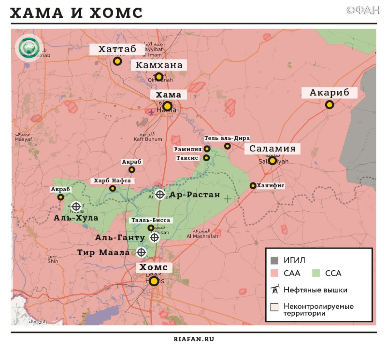 Восточнее города Саламия САА и Силы национальной обороны заняли населенные пункты Джавасият Джануби, Хаддаж, Расм Зейнаб, Тайба, Тамаз, Бир Гхазалла, Хирберт Амара и Вади Хулла, установив контроль над всем восточным флангом подконтрольного ИГИЛ города Акербат.