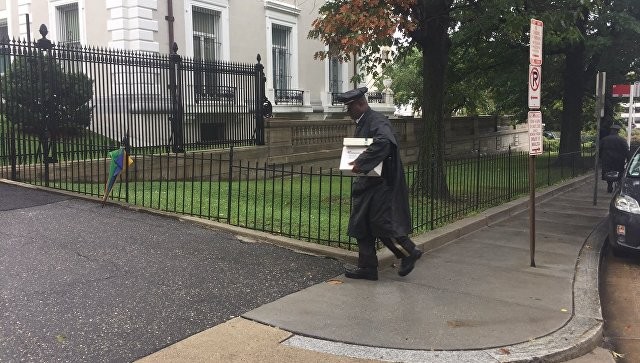 МИД РФ на опубликованном в Facebook видео показал американских правоохранителей, дежурящих на входе в российское торговое представительство в Вашингтоне. На видеоролике показаны два представителя американских властей, стоящих у входа на территорию торгпредства. При этом во двор заходят два человека.