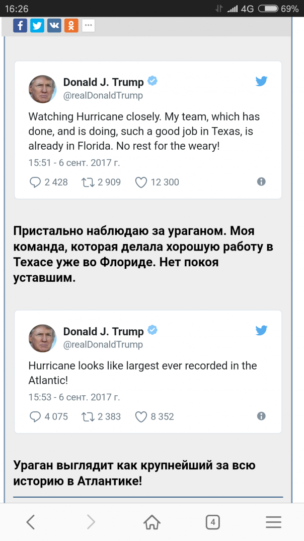 Кроме того, американский президент заявил, что пожертвует миллион долларов из личных средств в фонд борьбы с последствиями урагана.