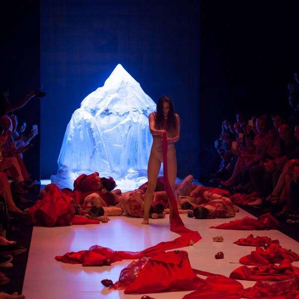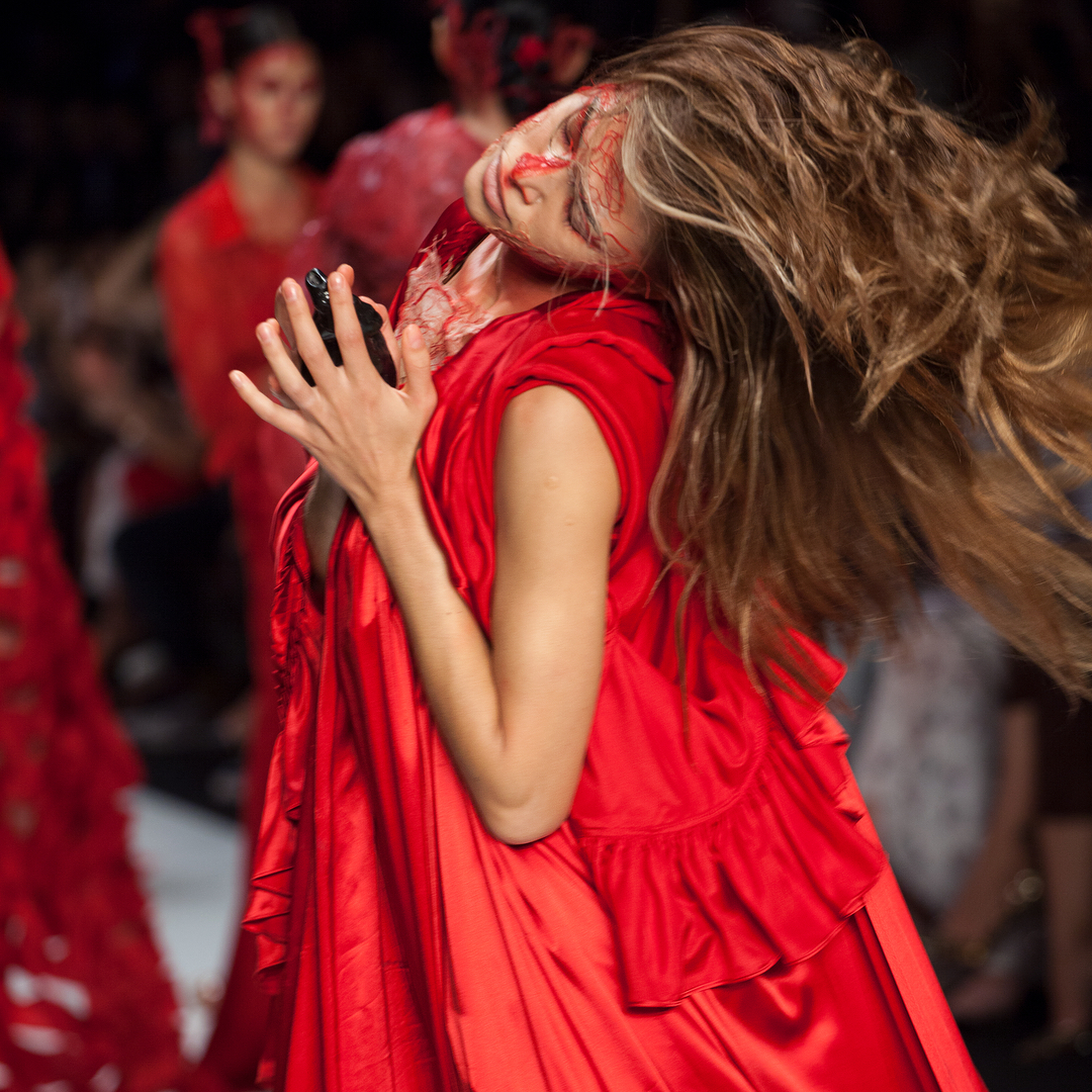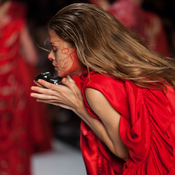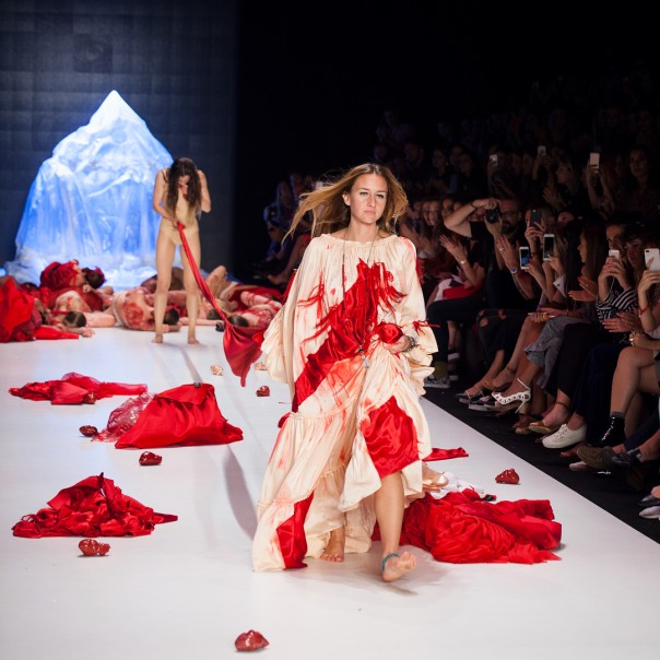 Красные нити, которые создавали иллюзию крови, были приклеены к телам моделей, а на одежде красовались ярко-красные куски ткани. В одной из сцен модель якобы хватается за выпущенные кишки девушки и тянет их по всему подиуму.