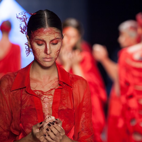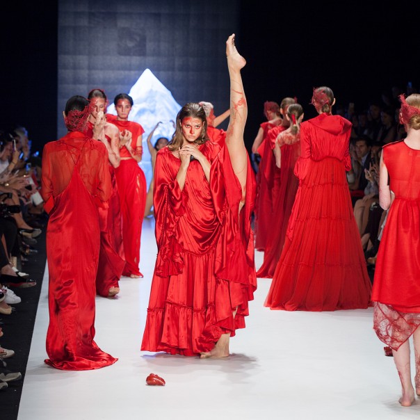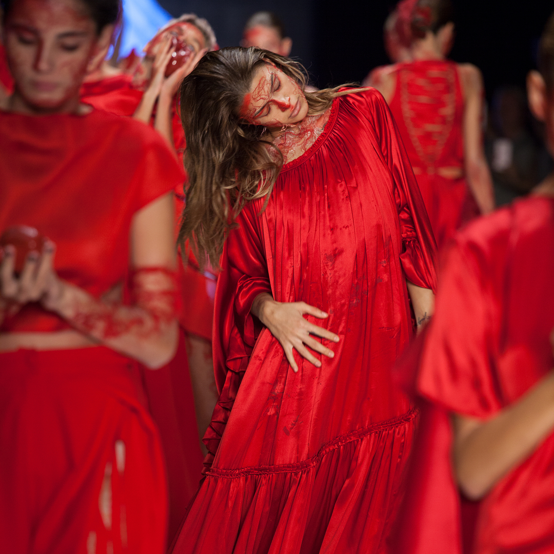 На Неделе моды в Стамбуле турецкий дизайнер Башак Канкеш решил удивить не своей коллекцией одежды, а шоу с участием моделей. На подиуме девушки были одеты в красные платья либо в телесные боди, но обязательным элементом в новой коллекции была "кровь".
