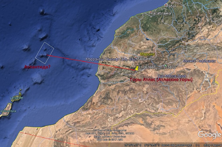 Дегтерев, проштудировав слова Платона о чудесном острове, выяснил, что он находился на западе от Геркулесовых столбов, напротив гор Атлас (Атлаские горы) — это большая горная система на северо-западе Африки, тянущаяся от атлантического побережья Марокко через Алжир до берегов Туниса. Длина хребтов составляет 2092 км. Координаты 31.061667°, -7.915833°.