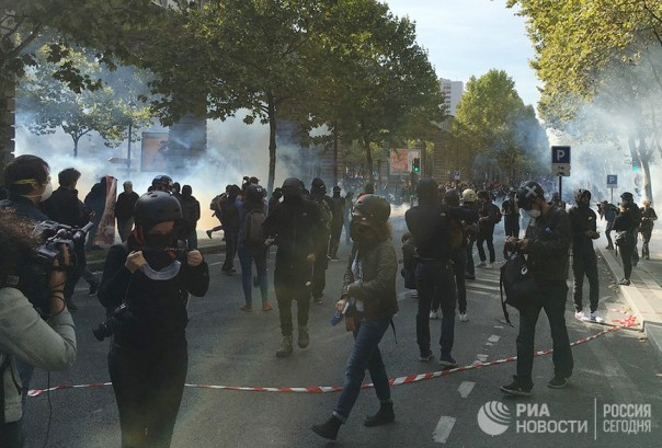 Участники акции протеста против трудовой реформы в Париже, Франция. 21 сентября 2017