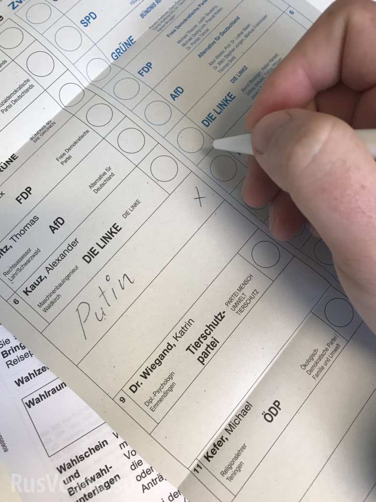 Кроме того, пользователи соцсетей публикуют фото бюллетеней, на которых немцы пишут имя Владимира Путина и ставят напротив него крестик. Судя по всему, таким образом граждане выражают свой протест против политики действующей власти.