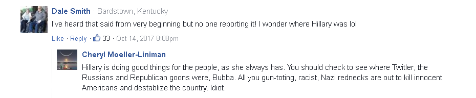 "Хиллари делает хорошие вещи для людей, как и всегда. Ты должен проверить, где были Твиттер, русские и республиканские жлобы и Бубба. Все вы пушечное, расистское, нацистское быдло, убиваете невинных американцев и дестабилизируете страну. Идиоты,"- возмущен другой