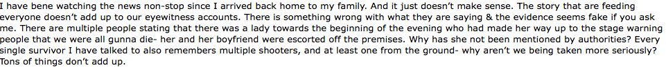 "Каждый выживший, с кем я разговаривала, помнит, что было несколько стрелков, и, по крайней мере, один стрелял с земли - почему нас не воспринимают серьезно? Куча вещей не складываются в картинку”, - написала она в Facebook.- "С тех пор, как вернулась домой, я постоянно наблюдаю за новостями. И это просто бессмыслица. История не складывается из-за наших свидетельств как очевидцев. Есть что-то, что не так с тем, что они нам говорят, и доказательства у них поддельные, если вы спросите меня.”
