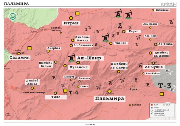 В провинции Дейр-эз-Зор САА продвинулась вглубь территории ИГИЛ к северу от административного центра на восточном берегу реки Евфрат. По данным лояльных правительству источников, в настоящий момент под контролем правительственных сил находятся все деревни. Однако, данные сообщения все еще должны быть подтверждены фото или видео.