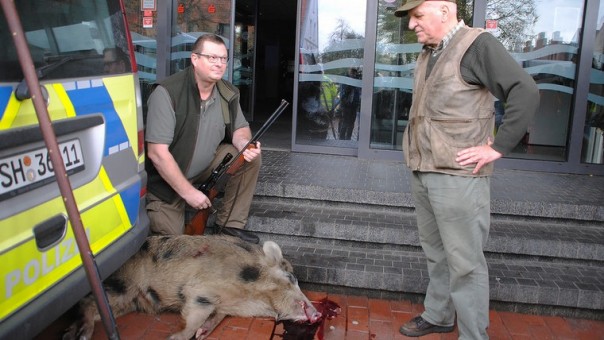 По сообщению ndr.de две диких свиньи появились в центре города Хайде (Шлезвиг-Голштейн, население около 20 тыс. человек) и вели себя крайне агрессивно. Одна из них забежала в пекарню, другая вломилась в стеклянные двери банка.