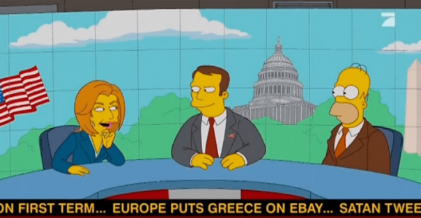 Пять лет назад вышла серия, где Гомер Симпсон появляется в выпуске новостей. Бегущая строка внизу экрана сообщает, что Европа выставила Грецию на eBay.