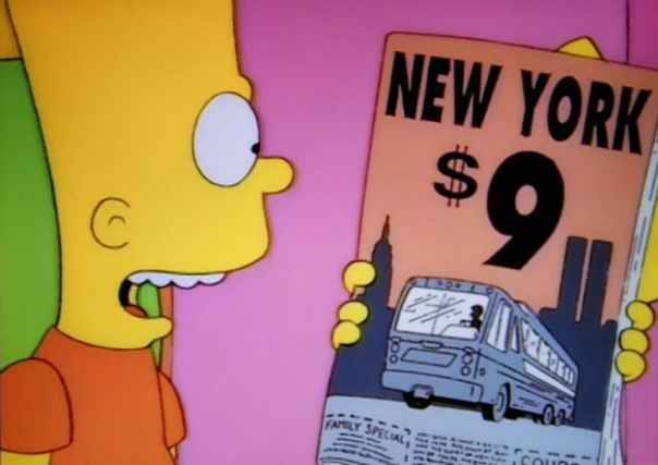 Симпсоны много путешествовали по миру в разных сериях. Но особенно запомнилась их первая поездка в Нью-Йорк в 1997 году, где фигурировал журнал с рекламой билетов за 9 долларов.