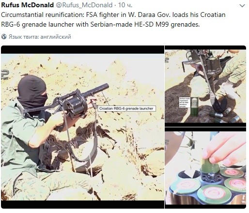 На днях блогер опубликовал фото хорватского гранатомета RBG-6 в руках боевика «Сирийской свободной армии» (FSA) в западной Дараа.