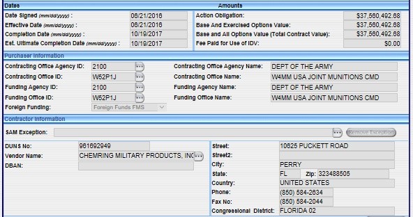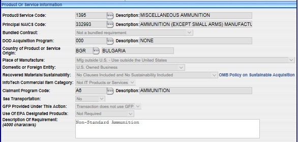 Один из заказов для американского подразделения британской Chemring на доставку «нестандартных» боеприпасов из Болгарии на $ 37,5 млн. Скриншот с сайта fpds.gov.
