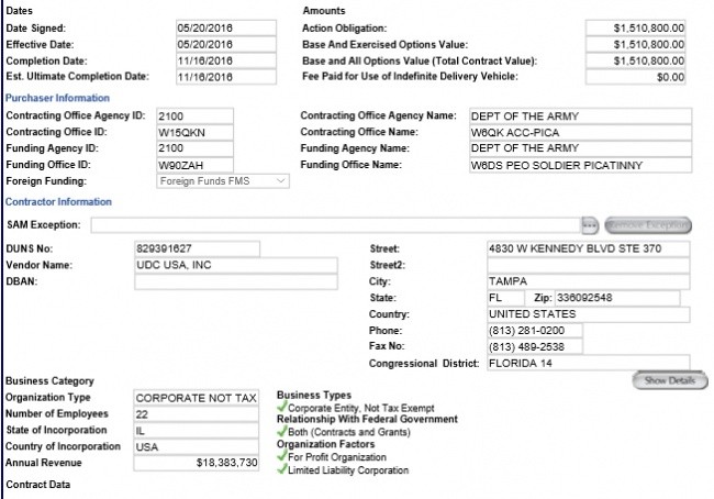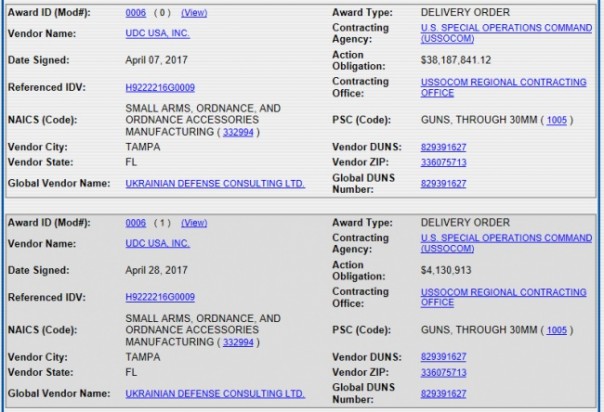 UDC USA, по данным Федеральной системы закупок США, является частью компании Ukrainian Defense Consulting Ltd. («Украинский оборонный консалтинг»). Скриншот с сайта fpds.gov.