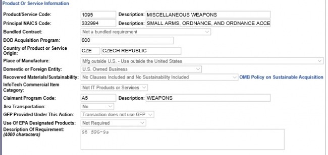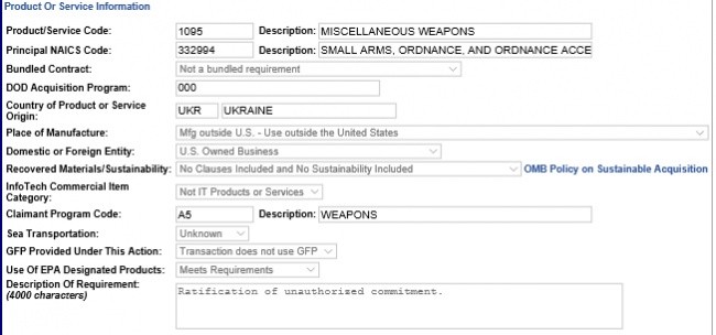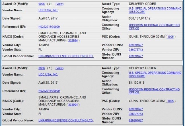 Один из заказов (на $ 1,5 млн) для UDC на поставку 95 противотанковых гранатометов SPG-9 из Чехии. Скриншот с сайта fpds.gov.