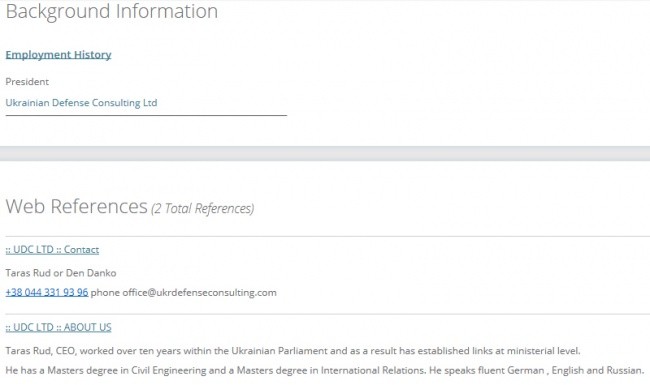 В базах данных эта компания зарегистрирована на Сейшельских островах и в Киеве, а ее собственником и президентом является некий Тарас Рудь. О себе на сайте Zoominfo он указал, что более 10 лет проработал в украинском парламенте и имеет связи на уровне министерств. У головной компании нет собственного сайта, а на портале UDC USA представлен лишь список услуг.