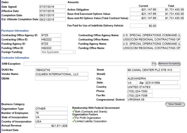 Контракт с Culmen International предполагал поставку украинских вооружений на $ 21 млн, но в середине 2016 года его сократили до $ 1,7 млн. Скриншот с сайта fpds.gov.
