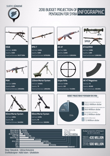 В 2018 году только Пентагон планирует потратить на подготовку и вооружение в Сирии $ 500 млн. По проекту бюджета, группировкам общей численностью до 30 тысяч человек поставят 12 тысяч автоматов АК-47, 6 тыс. пулеметов ПКМ, 3,5 тыс. крупнокалиберных пулеметов ДШК, 3 тыс. РПГ-7, 1 тыс. ручных гранатометов АТ-4 или СПГ-9, 255 минометов и 100 снайперских винтовок.