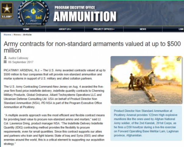 Сентябрьский пресс-релиз Picatinny Arsenal о том, что контракты на $ 500 млн обеспечат оружием, прежде всего, Сирию и Ирак. Скриншот с сайта pica.army.mil.