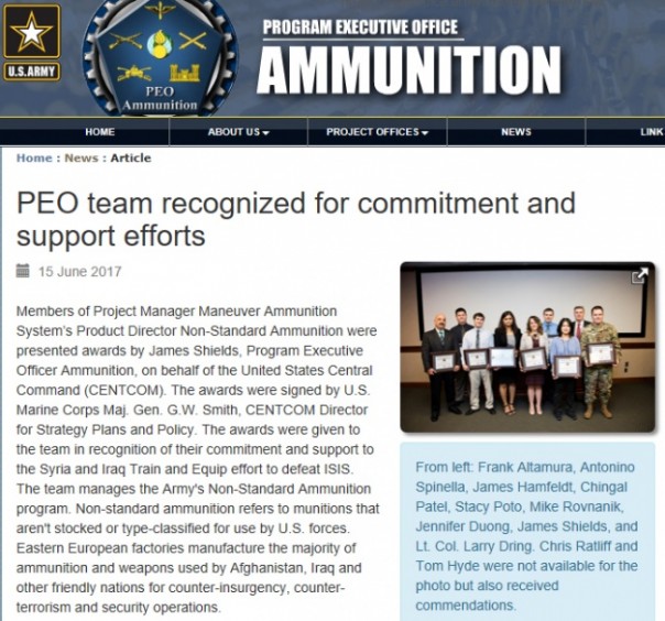 Показательным может быть июньский пресс-релиз структуры Пентагона по снабжению войск, Picatinny Arsenal. В нем говорится о награждении команды этой армейской структуры Центральным командованием США за вклад в программу по обучению и вооружению союзников в Сирии и Ираке для победы над ИГ.