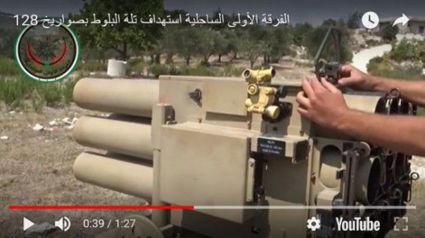 Из этой пусковой установки боевики группировки «Первый береговой дивизион» собираются стрелять по правительственным войскам в Латакии. На табличке на установке написано: «128-мм РСЗО RAK-SA-12. Сделано в Хорватии». Фото: twitter.com.