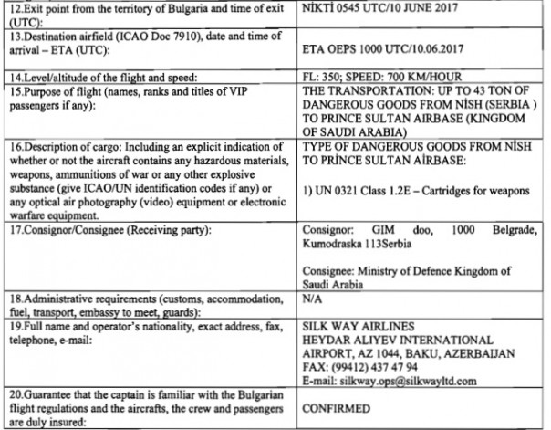 При этом Хорватия, поставлявшая оружие Саудовской Аравии в 2014 году на 25 млн евро в год, заявила об увеличении общего экспорта почти вдвое — до 225 млн евро. А последние данные по Сербии, за 2014 год, показали экспорт вооружений в королевство на уровне 45 млн. При этом, по данным документов BIRN и переписке посольства Азербайджана в Болгарии, за первую половину прошлого года авиакомпании Ruby star, Airbridge Cargo, Transavia Export и Airbridge Cargo совершили 30 рейсов по транспортировке вооружений из Сербии и Словакии в Саудовскую Аравию, ОАЭ и Иорданию, а азербайджанская Silk Way за этот и прошлый год — 12 рейсов.