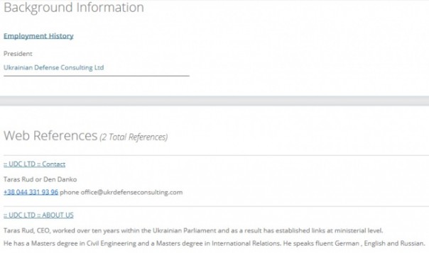 Основатель Ukrainian Defense Consulting Ltd более 10 лет проработал в украинском парламенте и имеет связи на уровне министерств. Скриншот с сайта: zoominfo.com.