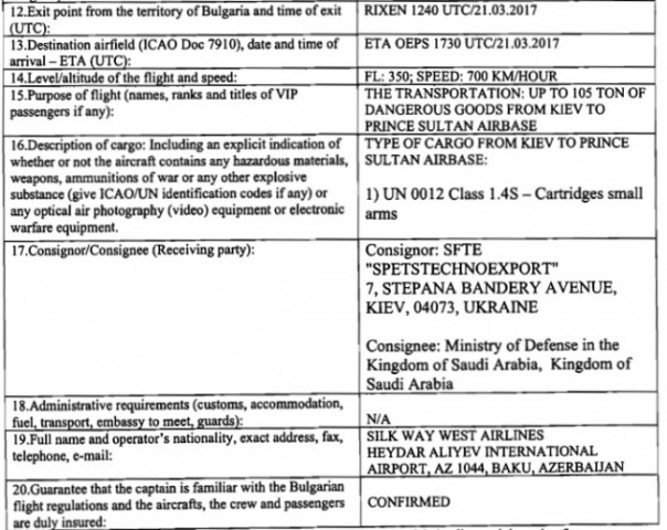 Для Киева это были не единственные контракты на поставку «нестандартных» вооружений для США. «Укрспецэкспорт» дважды заключал с Picatinny arsenal контракты на поставку малых вооружений. Последний — в июне на $ 18 млн. Однако ни один из них выполнен до сих пор не был из-за отсутствия заказов из США. Чего не скажешь о Саудовской Аравии. В материалах азербайджанской Silk way есть документы на оформление рейса 21 марта этого года из Киева на авиабазу «Принц Султан» в Саудовской Аравии для доставки до 105 тонн патронов (международная классификация UN0012 1.4s). Поставщиком выступало украинское предприятие «Спецтехноэкспорт», а получателем — Минобороны Саудовской Аравии.
