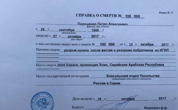 Петро Алексеевич Порошенко — по предварительным данным, этот наёмник поехал на заработки и погиб от «разрыва пукана» в селе Караси провинции Хомс, о чём написано в документе.