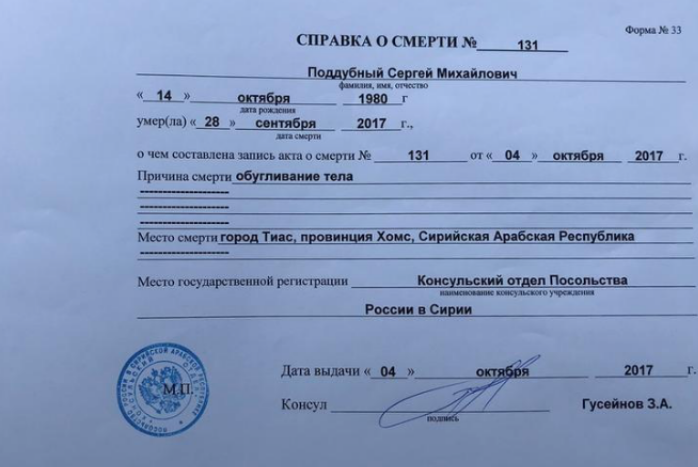 «Рейтерс» установило указанное выше количество умерших в САР российских граждан, проанализировав данные, которые указаны в «справке о смерти» № 131 от 04.10.17, выданной на имя 36-летнего краснодарца Сергея Поддубного, погибшего 28.09.2017 г. в г. Тиас сирийской провинции Хомс.
