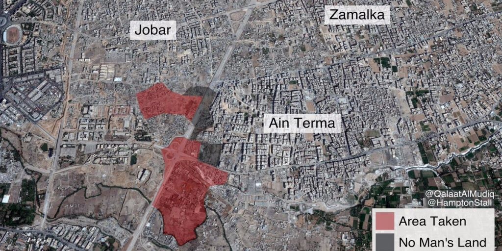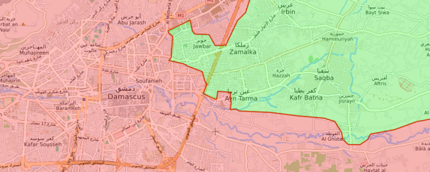 14.40. На востоке Дамаска, в районе Джобар Восточной Гуты, боевики группировок FSA сообщают о «неопознанных» авиационных ударах. Также арабский источники публикует актуальную карту контроля и продвижения сил Сирийской арабской армии: красный цвет — правительственные войска, черный — безлюдные участки.