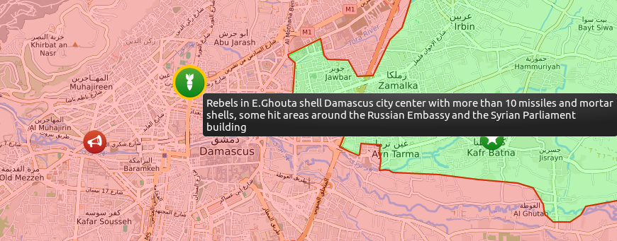 17.30. Боевики группировок FSA из Восточной Гуты обстреляли из минометов и выпустили более 10 реактивных снарядов по северным окраинам Дамаска близ российского посольства и и здания сирийского парламента.