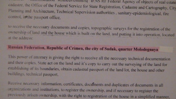«Доверенность, в 2016 году подтвержденная большой гербовой печатью штата Айдахо и подписью «secretary of state» (секретаря или, проще говоря, главы штата) Айдахо и нотариуса, содержит адрес помещения. В адресе указано: Российская Федерация, Республика Крым, г. Судак…