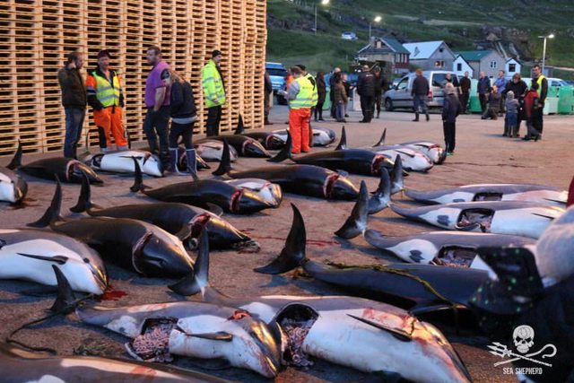 По предварительным подсчётам, по меньшей мере за девять проведённых охот было убито 436 гринд и 198 атлантических белобоких дельфинов. На место прибыли 18 волонтёров из Великобритании и Франции, чтобы показать миру продолжающиеся варварские убийства животных на Фарерских островах.