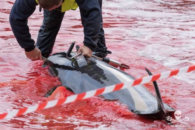 Эти снимки были сделаны на Фарерских островах волонтёрами из природоохранной организации Sea Shepherd Global. На фотографиях местные жители загоняют гринд и дельфинов на мелководье, где затем убивают их с помощью длинных ножей. Лезвие вонзают в шею животного, чтобы сломать ему спинной мозг, сообщает Metro.