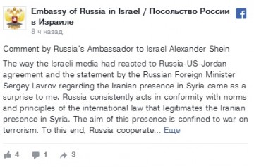 В канцелярии Биньямина Нетаниягу и в министерстве иностранных дел Израиля отказались комментировать заявление российского посла. Источник