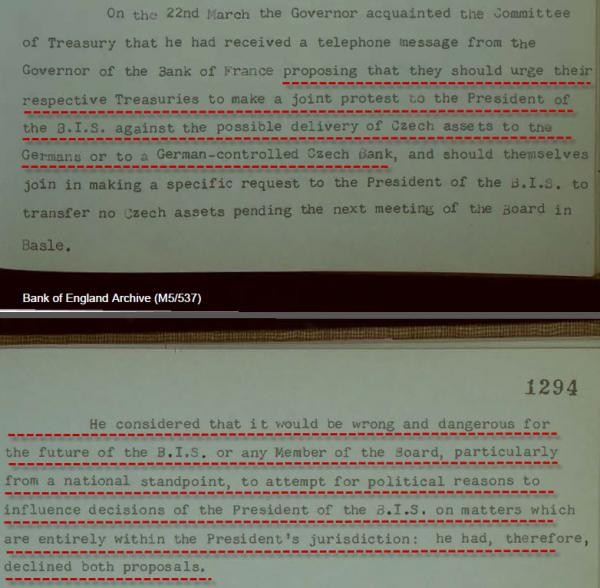 Физически золотые слитки Чехии содержались в хранилище Банка Англии в Лондоне. 21 марта 1939 г. «было получено распоряжение от председателя совета правления Банка международных расчетов Отто Нимейера о переводе золотых слитков со счета № 02 на счет № 17». Золото на счету № 02 принадлежало Национальному банку Чехословакии. Счет № 17 принадлежал Рейхсбанку. БМР выступал в качестве управляющего активами от лица национальных банков.
