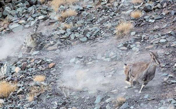 А однажды, после шестичасовой засады, фотографы сняли невероятно редкие кадры охоты барса на голубых баранов. Рассматривая фотографии, Ингер обнаружила, что они отлично иллюстрируют способность барсов маскироваться в горах. Один из таких снимков она выложила в Twitter с подписью «С ума сойти. Найдите барса».
