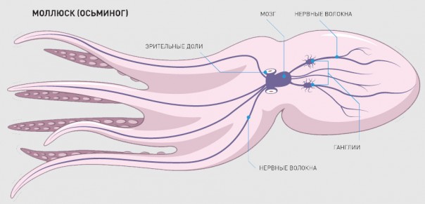 От раковины предшественники головоногих отказались еще около 500 млн лет назад, предпочтя свободу и движение. Предки осьминогов, которых сегодня насчитывается около 200 видов, стали активными хищниками и потенциально доступными жертвами и, видимо, не могли не развить сложную, уникальную для беспозвоночных нервную систему. Она содержит порядка 500 млн клеток — больше, чем у крысы, и почти как в головном мозге кошки.