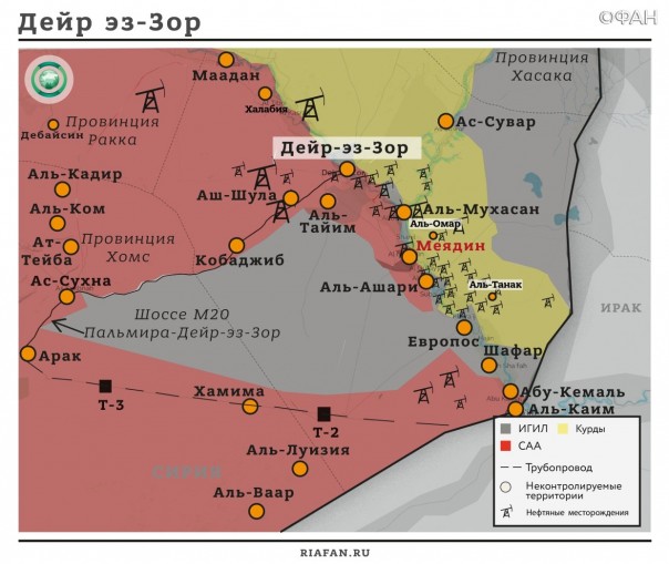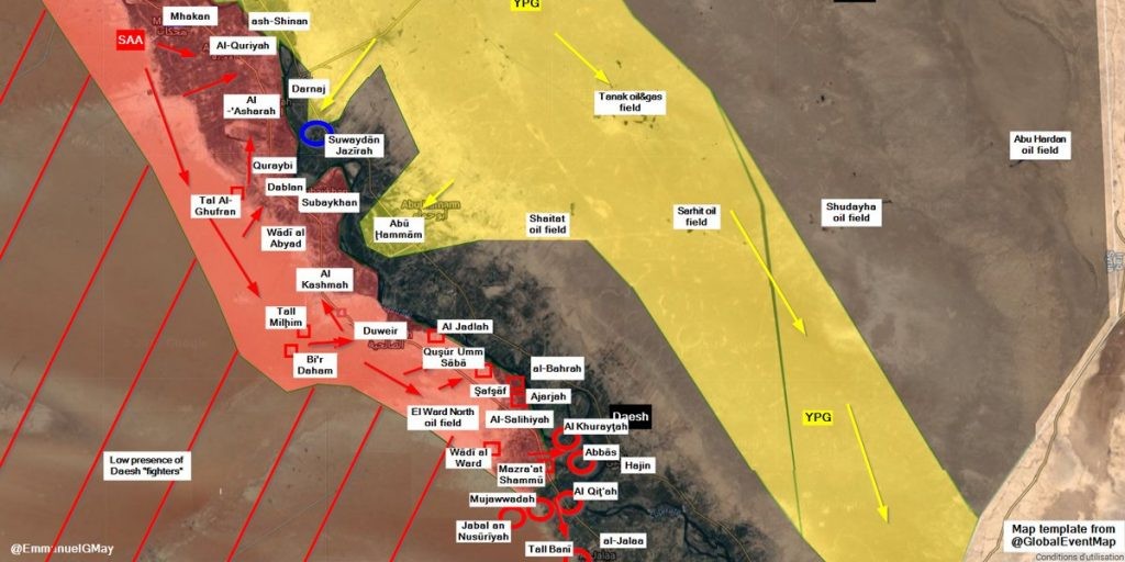 От ИГИЛовцев были зачищены города Аль-Джалаа, Ар-Рамади и Аль-Бурхам. Также данные сведения подтверждает официальный Twitter-аккаунт ливанской организации «Хезболла» (@Syria_Hezb_Iran). В том случае если силам САР удастся дойти до Абу Кемаля, отряды «Исламского государства»* в юго-западной части провинции окажутся в окружении на пустынных территориях.