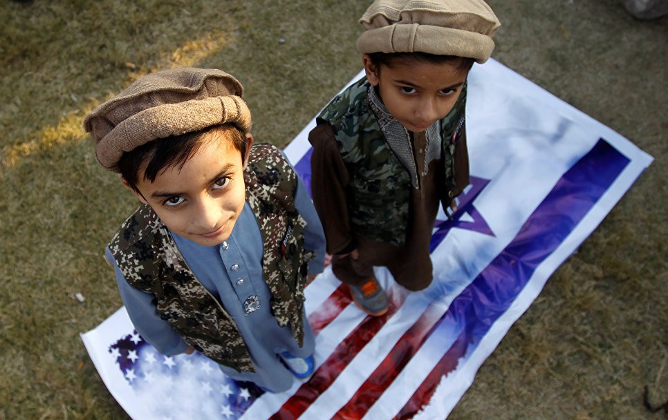 Дети стоят на флагах США и Израиля во время протеста против решения президента США Дональда Трампа признать Иерусалим столицей Израиля в Исламабаде